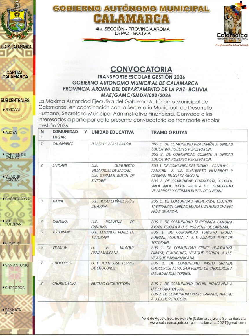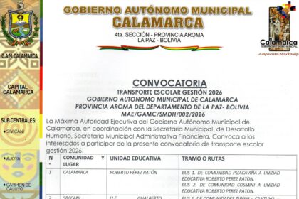 El Gobierno Municipal extiende un saludo solemne, celebrando el legado histórico y el trabajo de sus habitantes. Calamarca, 1 de diciembre de 2025 – El Gobierno Autónomo Municipal de Calamarca…